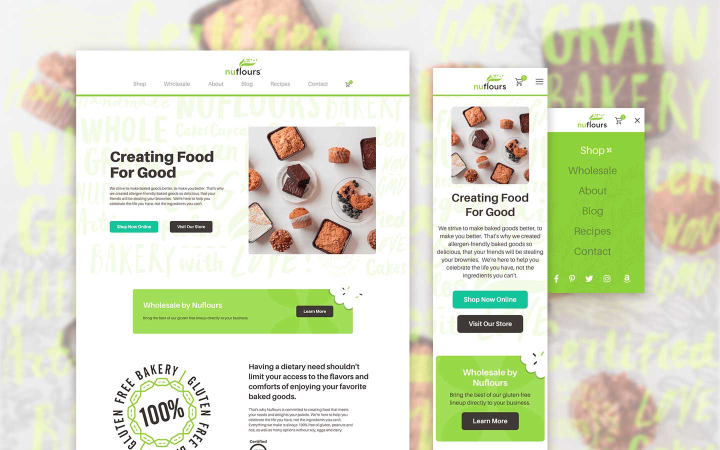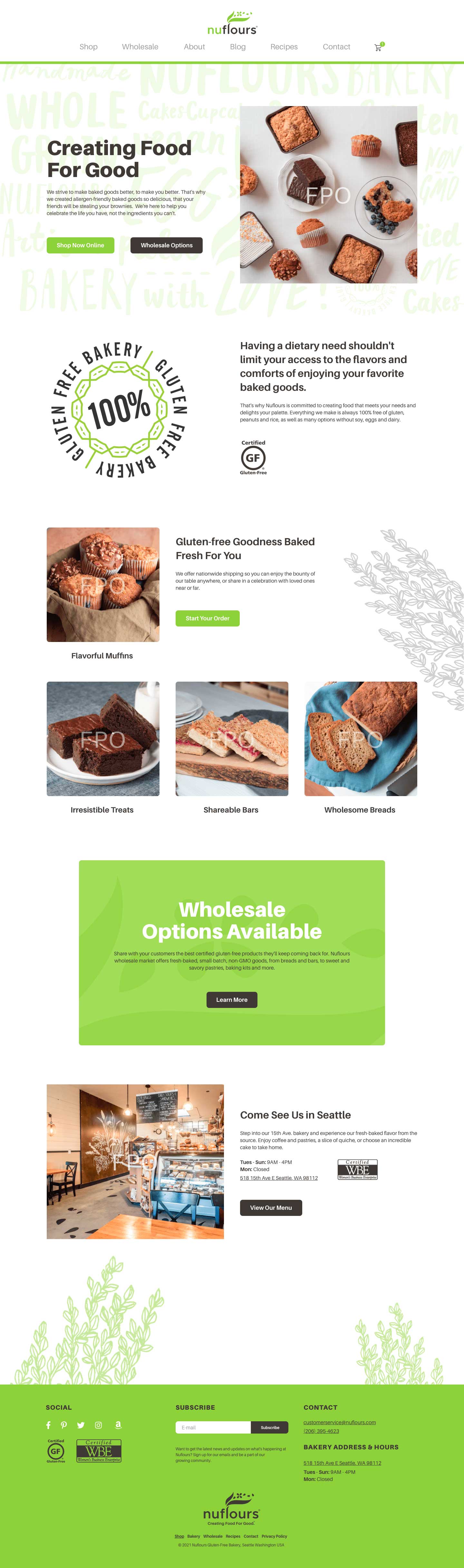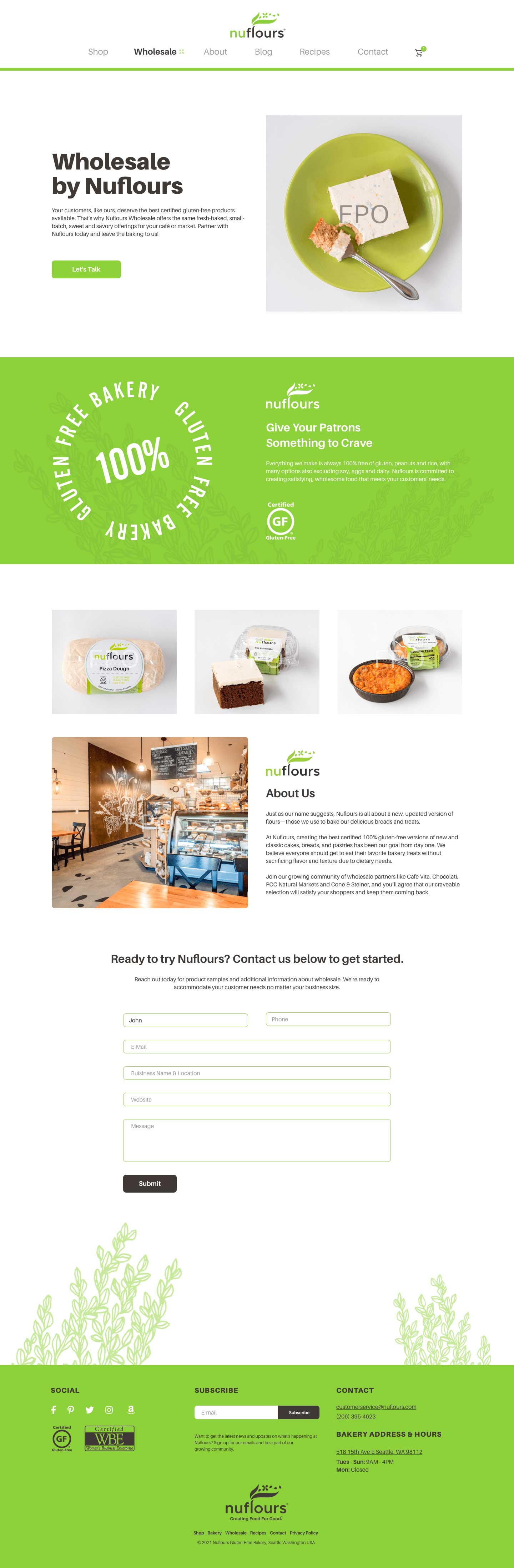 Located in the Downtown Seattle area, Nuflours specializes in producing the best gluten-free baked goods in the area. For this project, the client requested a site redesign, along with the goal of more effectively presenting their wholesale options. I conducted the entirety of the design, front-end development, and integration with their existing Shopify storefront.